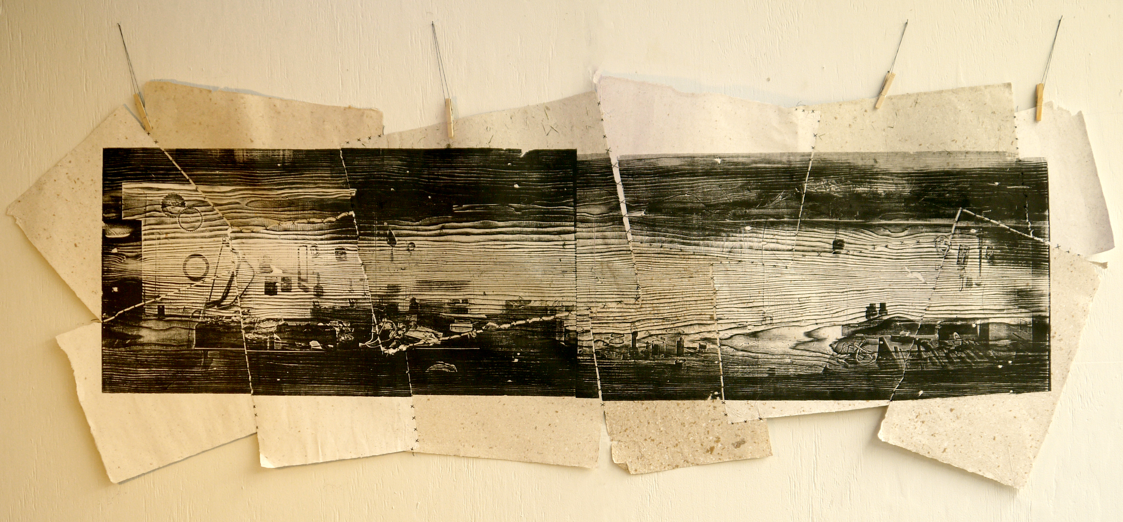 Laser etched woodblock prints on handmade paper, thread, ~72"x24, 2013